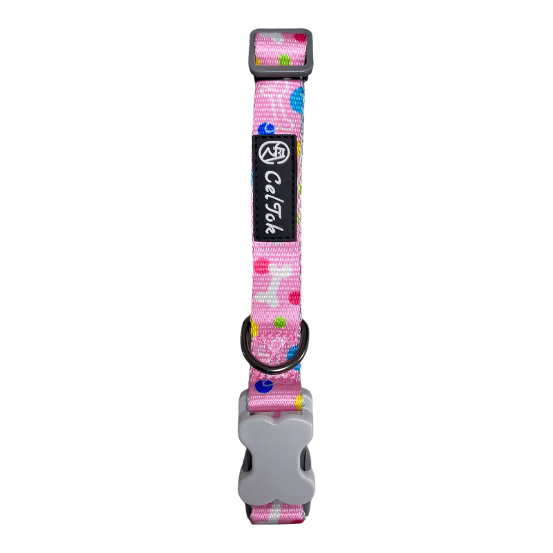 Este collar para mascotas combina un diseño alegre y colorido con un sistema de cierre seguro y funcional. Fabricado con correas de nylon de alta resistencia, presenta estampados dinámicos de huesos y puntos en diversas combinaciones de colores (azul, rosa y morado). Es el accesorio perfecto para identificar a tu mascota con estilo mientras garantiza comodidad durante todo el día.